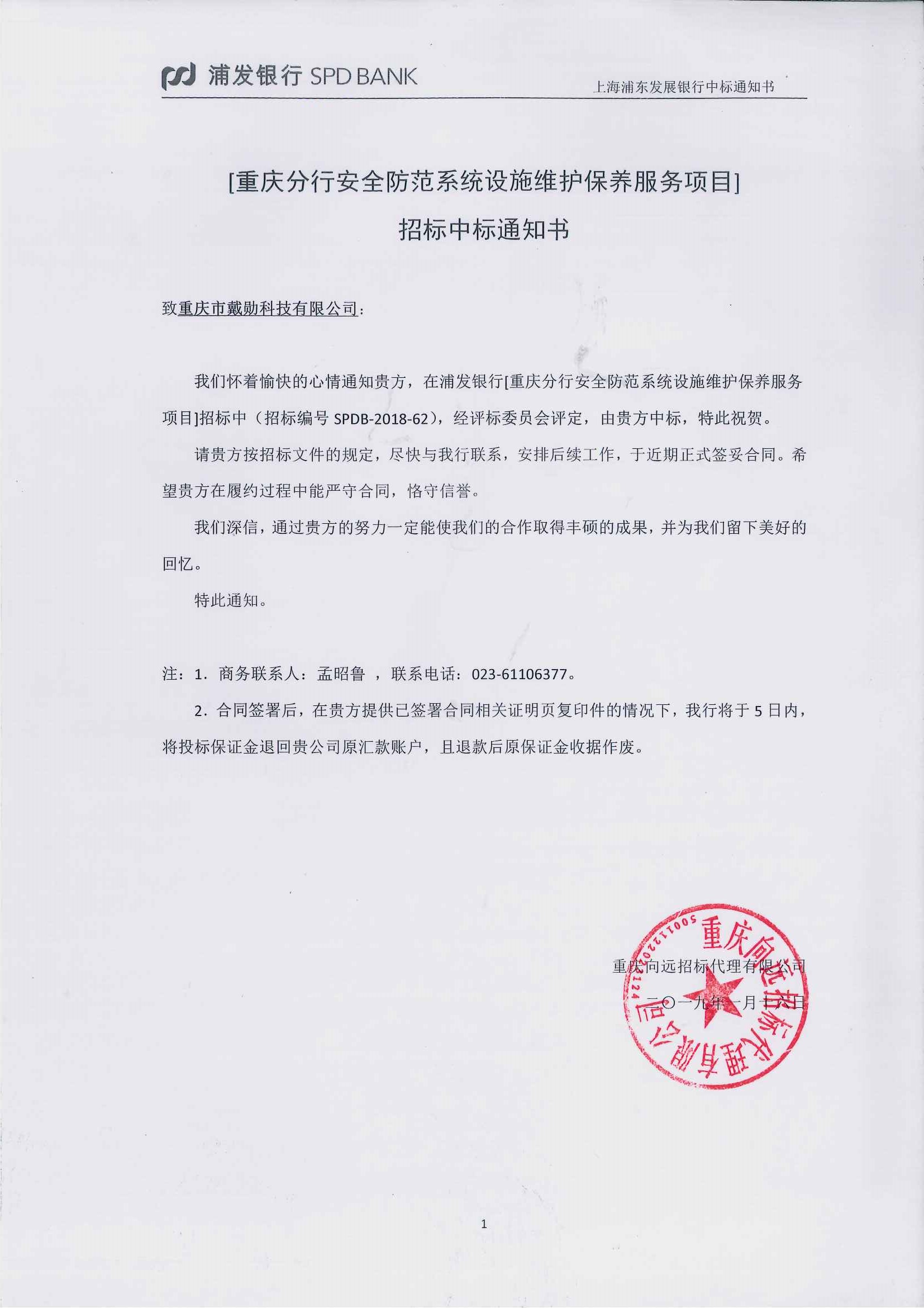 1、我公司中标:浦发银行重庆分行2019年度安全防范(监控)系统设施维护保养服务。